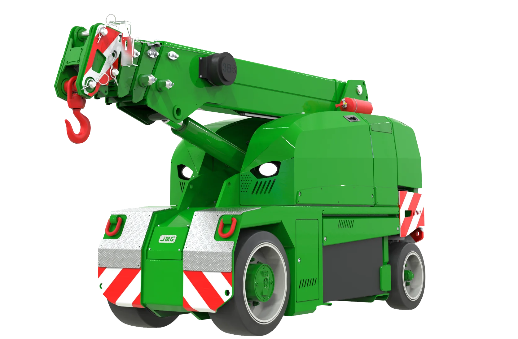 Grúa compacta con brazo telescópico y contrapesos desmontables. Ofrece alta maniobrabilidad en espacios estrechos.